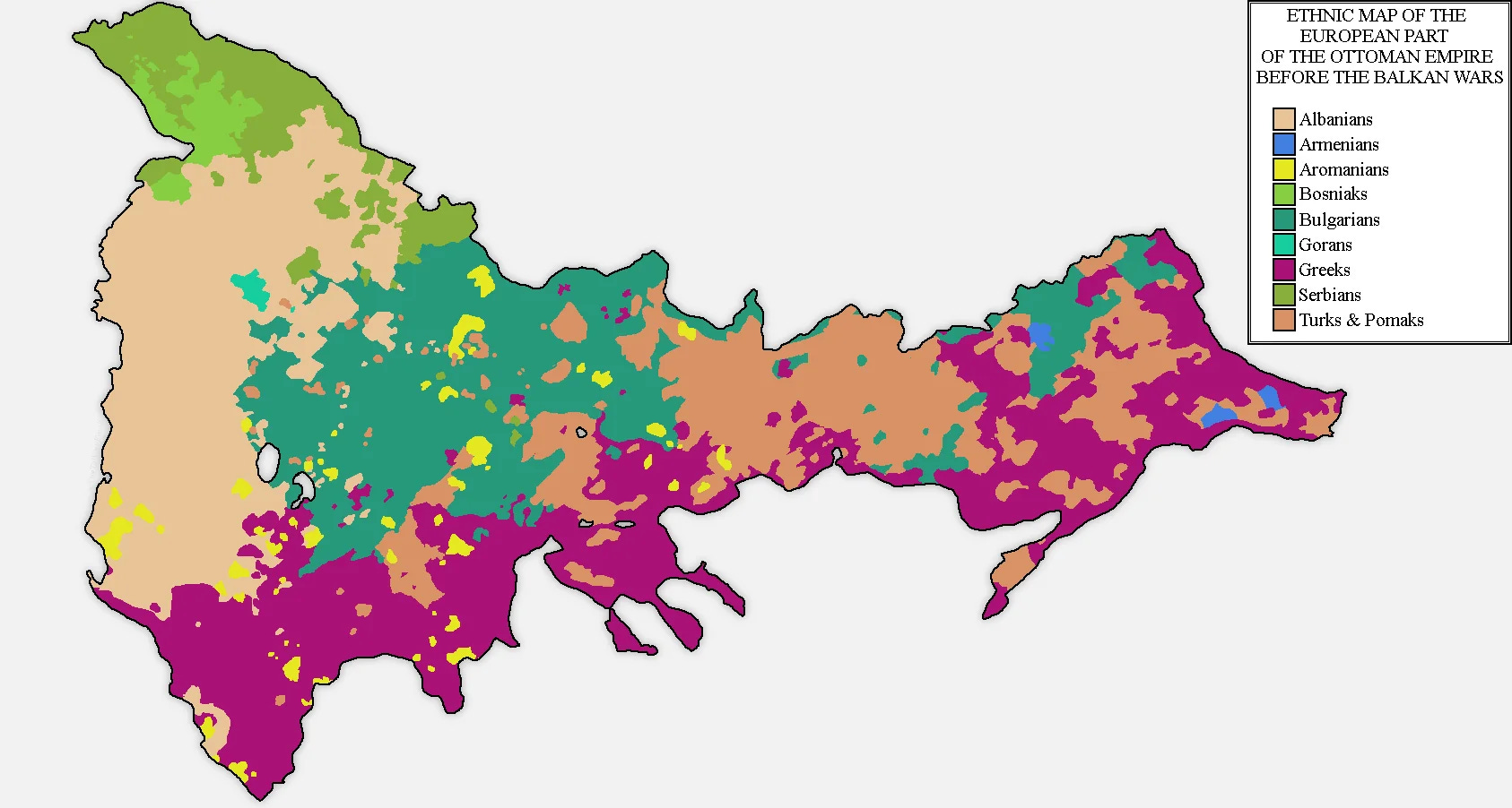 Ethnic map of European part of the Ottoman Empire, 1910, prior to the First Balkan Wars